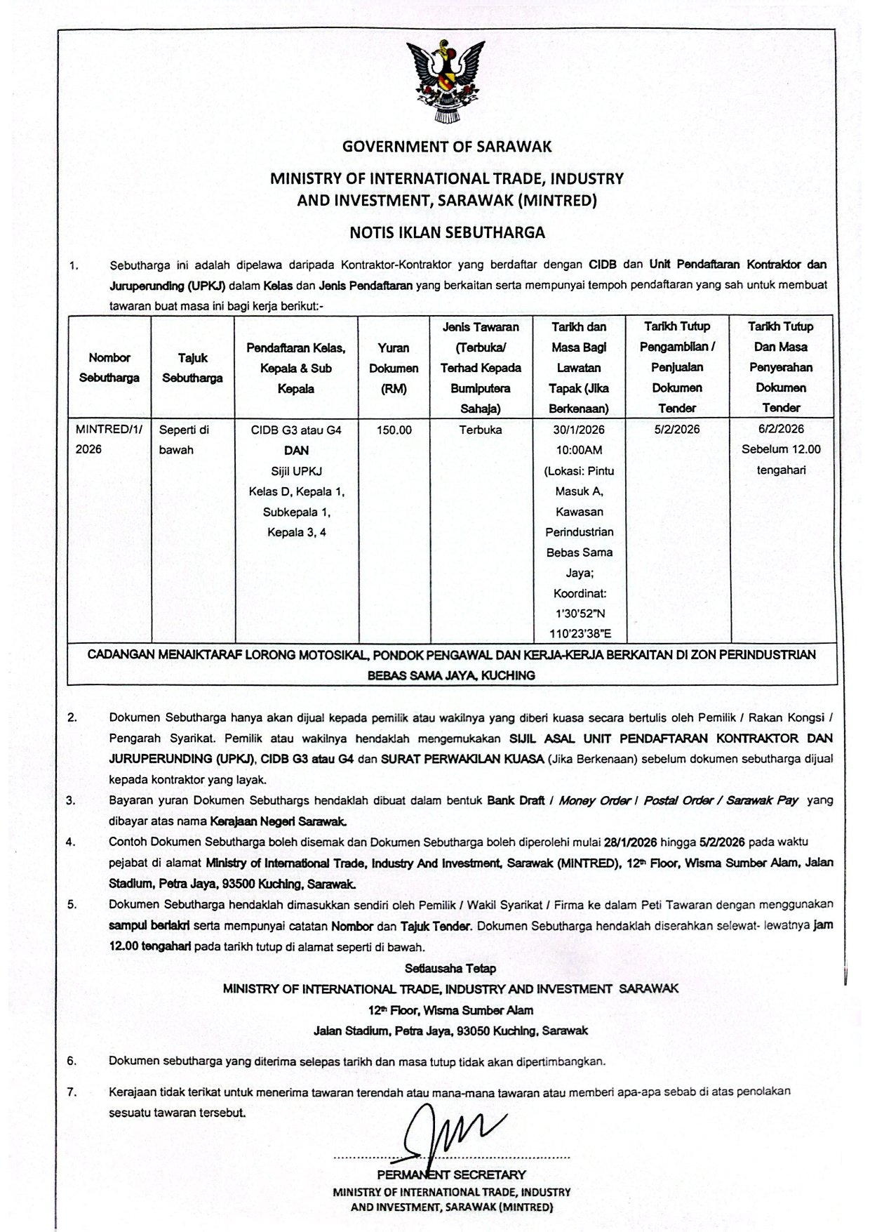 Notis Iklan Sebutharga : Cadangan Menaiktaraf Lorong Motosikal, Pondok Pegawal dan Kerja-Kerja berkaitan di Zon Perindustrian Bebas Sama Jaya, Kuching